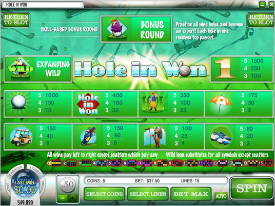 This i-Slot game can be played in denominations from 0.01 to 0.50 dollars with total bet sizes up to $37.50 with jackpots up to 1,500 coins and bonus rounds that pay out based on the performance of the player in that bonus round. Nine full mini golf holes to be played one at a time throughout the game. This is one game where practice will make perfect. |
